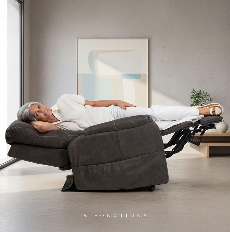 5 fonctions : réglages avancés (têtière/lombaires…), position proche de l’allongé.