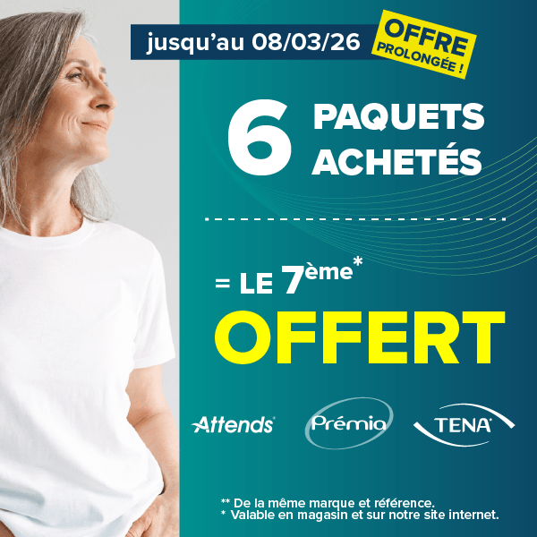 Jusqu'au 8/03/26, profitez d’une offre exceptionnelle sur les protections pour l’incontinence : pour 6 paquets achetés, le 7ᵉ est offert.